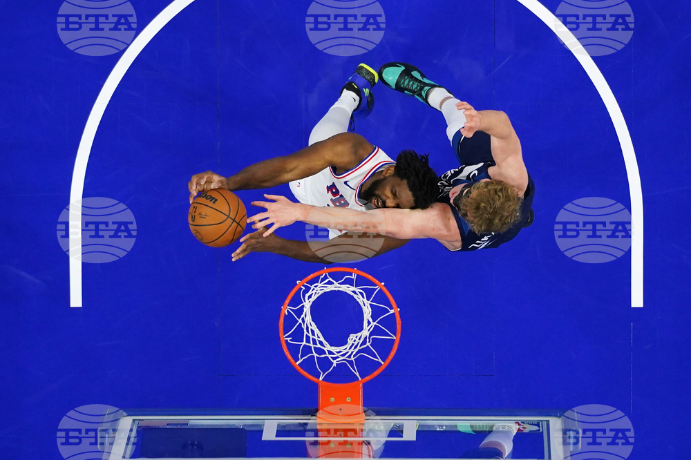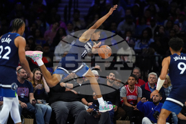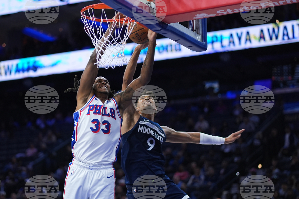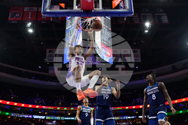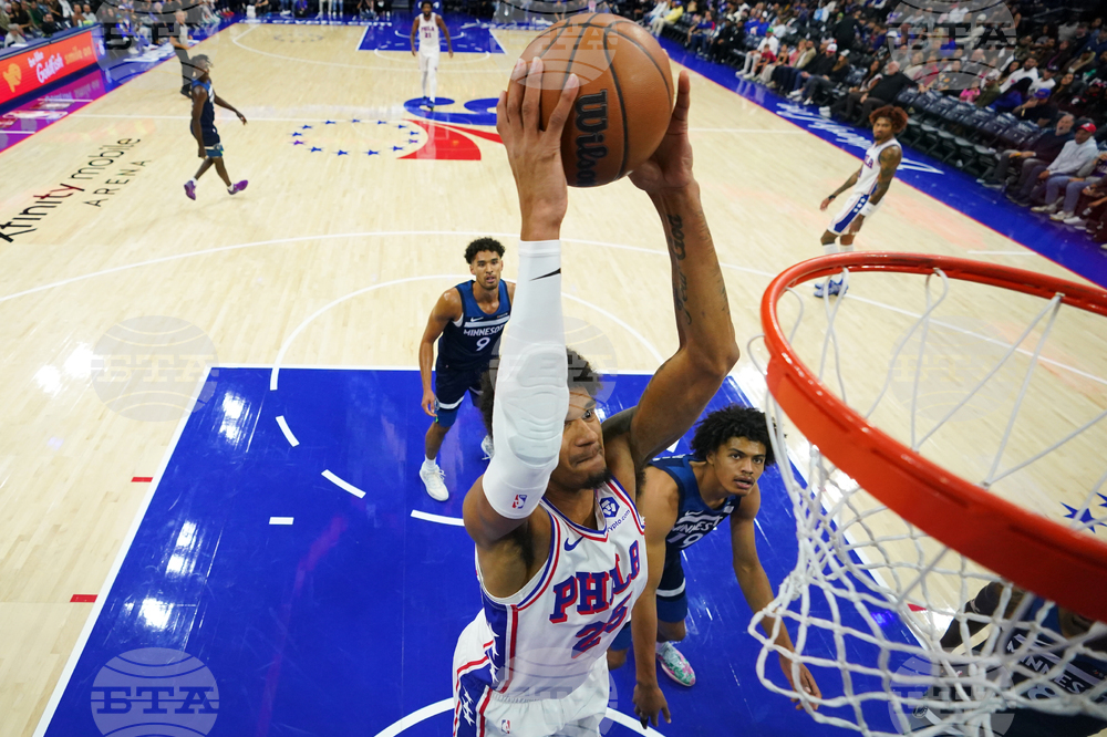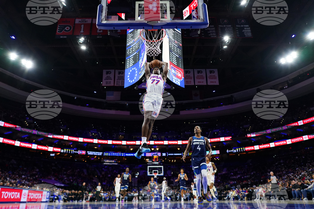 Philadelphia 76ers' Dominick Barlow (25) dunks past Minnesota Timberwolves' Johnny Juzang (9), Joan Beringer (19) and Bones Hyland (8) during the first half of an preseason NBA basketball game Friday, Oct. 17, 2025, in Philadelphia. (AP Photo/Matt Slocum)