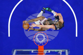 Philadelphia 76ers' Quentin Grimes (5) goes up for a shot against Minnesota Timberwolves' Johnny Juzang (9) during the second half of a preseason NBA basketball game Friday, Oct. 17, 2025, in Philadelphia. (AP Photo/Matt Slocum)