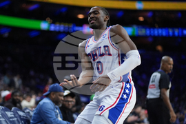Philadelphia 76ers' Tyrese Maxey reacts after a basket during the second half of a preseason NBA basketball game against the Minnesota Timberwolves Friday, Oct. 17, 2025, in Philadelphia. (AP Photo/Matt Slocum)