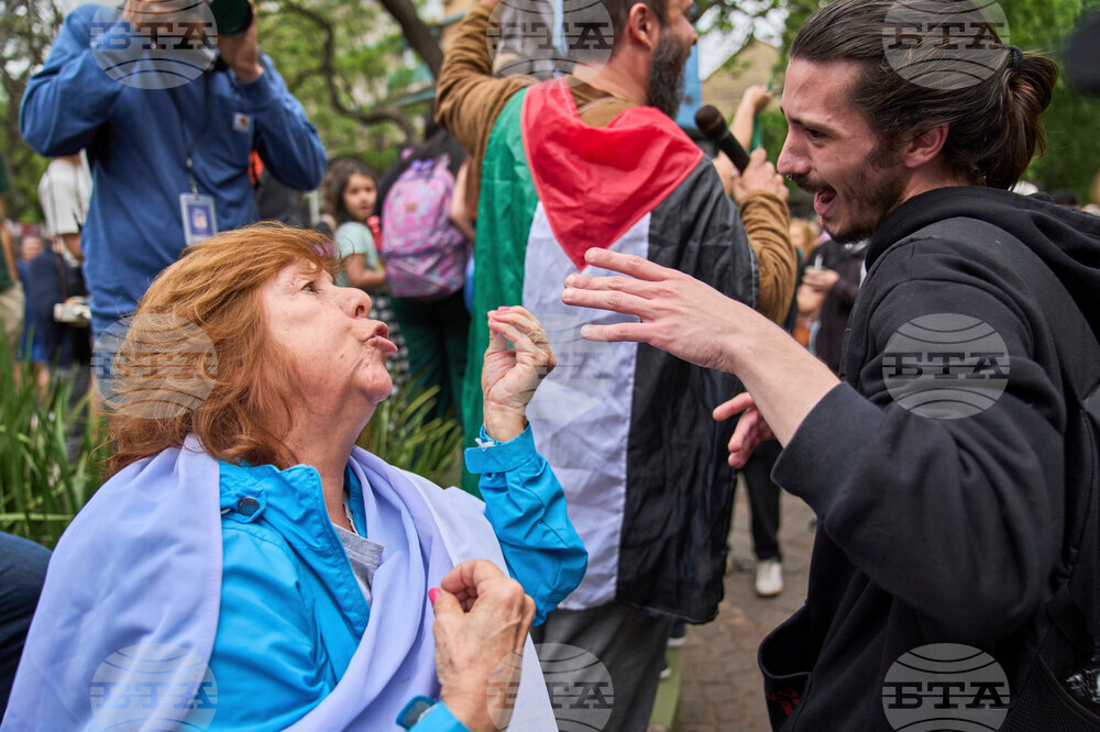 A supporter of President Javier Milei, left, argues with an anti-government demonstrator during a campaign rally ahead of mid-term elections, in Tres de Febrero, Buenos Aires province, Argentina, Friday, Oct. 17, 2025. (AP Photo/Rodrigo Abd)