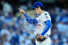 Los Angeles Dodgers pitcher Shohei Ohtani reacts during the fifth inning in Game 4 of baseball's National League Championship Series against the Milwaukee Brewers, Friday, Oct. 17, 2025, in Los Angeles. (AP Photo/Brynn Anderson)