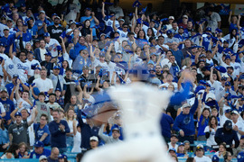 Fans watch as Los Angeles Dodgers pitcher Shohei Ohtani throws against the Milwaukee Brewers during the first inning in Game 4 of baseball's National League Championship Series, Friday, Oct. 17, 2025, in Los Angeles. (AP Photo/Brynn Anderson)