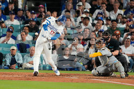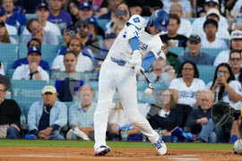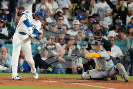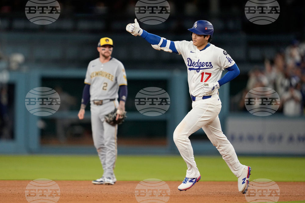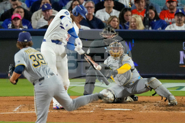 Los Angeles Dodgers' Shohei Ohtani his a home run against the Milwaukee Brewers during the fourth inning in Game 4 of baseball's National League Championship Series, Friday, Oct. 17, 2025, in Los Angeles. (AP Photo/Mark J. Terrill)