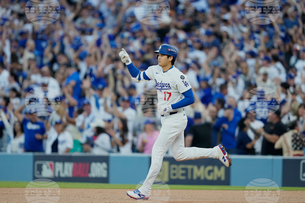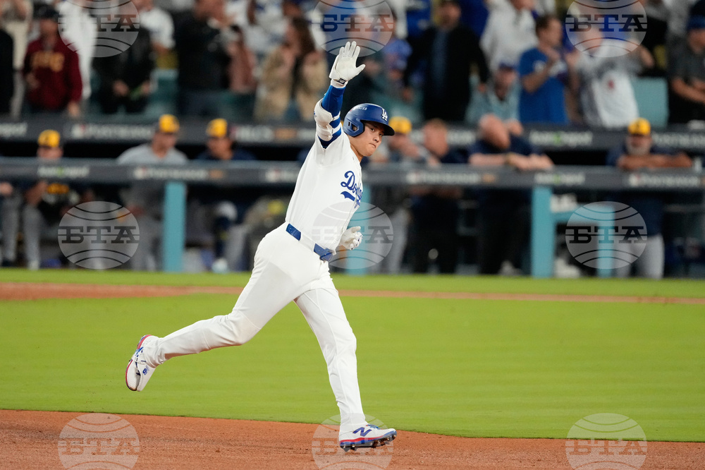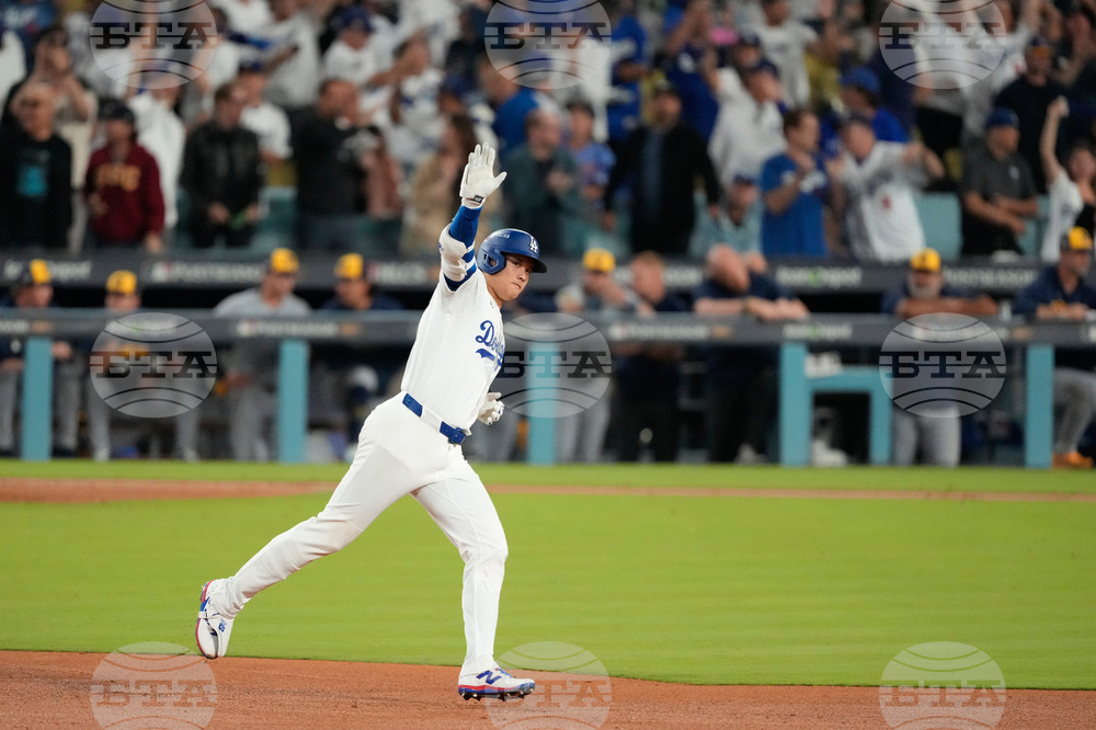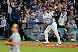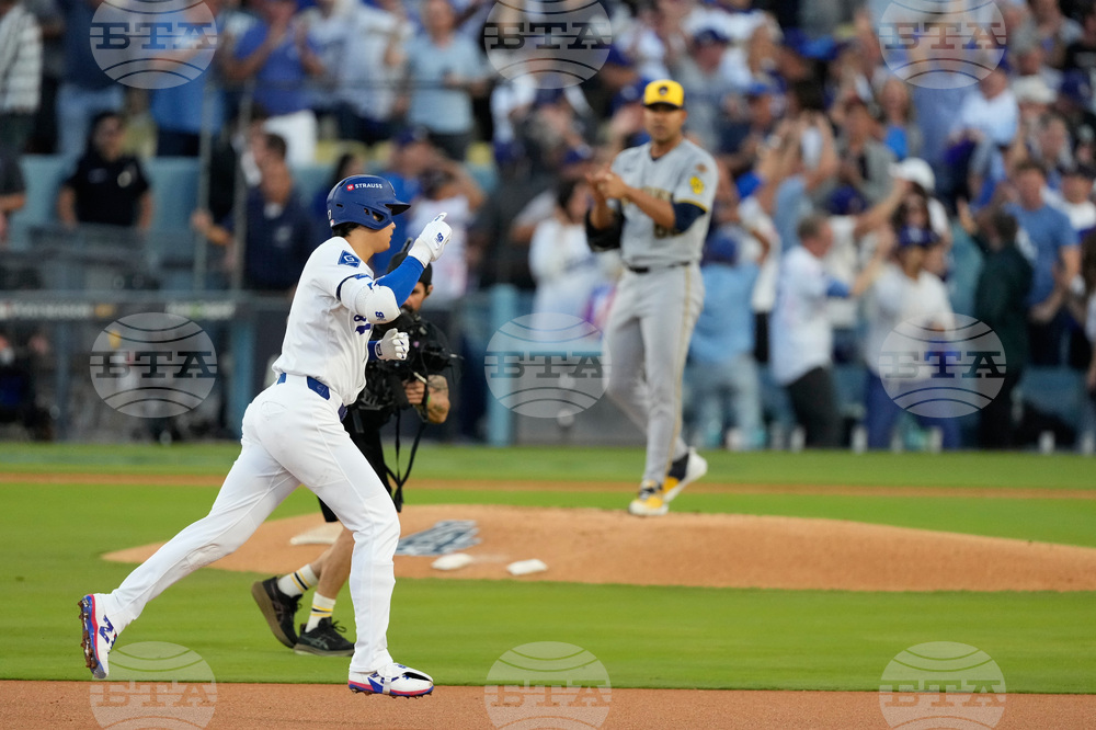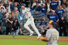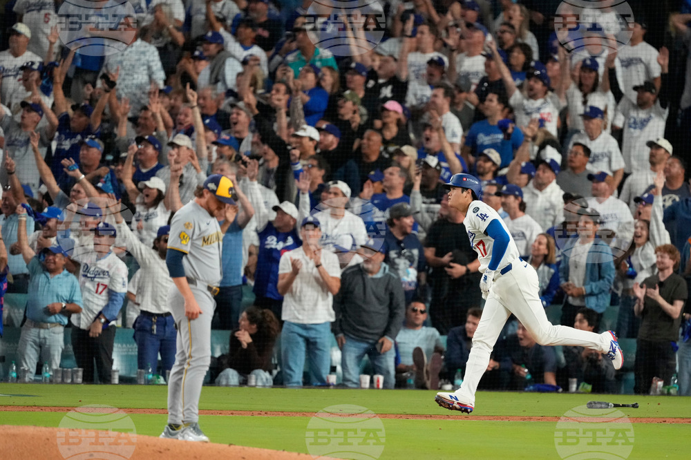 Los Angeles Dodgers' Shohei Ohtani celebrates after a home run against the Milwaukee Brewers during the first inning in Game 4 of baseball's National League Championship Series, Friday, Oct. 17, 2025, in Los Angeles. (AP Photo/Brynn Anderson)