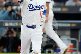 Los Angeles Dodgers pitcher Shohei Ohtani celebrates their win against the Milwaukee Brewers in baseball's National League Championship Series, Friday, Oct. 17, 2025, in Los Angeles.(AP Photo/Brynn Anderson)