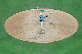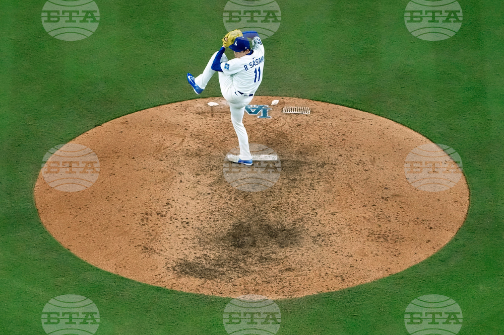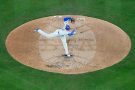 Los Angeles Dodgers pitcher Roki Sasaki throws against the Milwaukee Brewers during the ninth inning in Game 4 of baseball's National League Championship Series, Friday, Oct. 17, 2025, in Los Angeles. (AP Photo/Brynn Anderson)