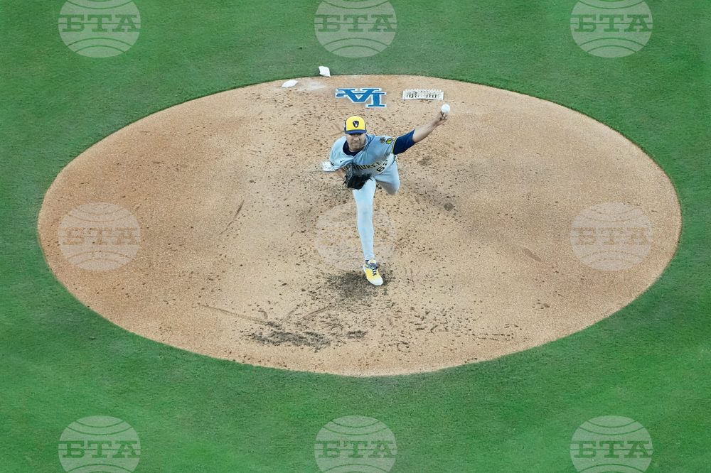 Milwaukee Brewers pitcher Chad Patrick throws against the Los Angeles Dodgers during the third inning in Game 4 of baseball's National League Championship Series, Friday, Oct. 17, 2025, in Los Angeles. (AP Photo/Ashley Landis)