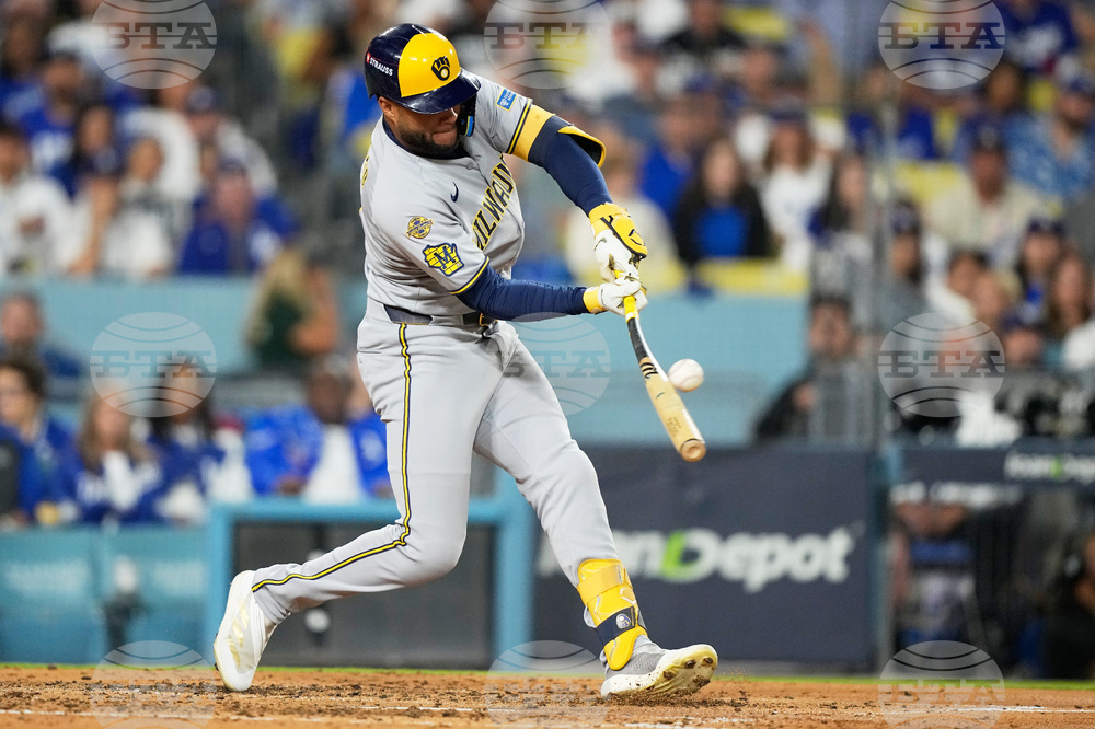 Milwaukee Brewers' Jackson Chourio doubles against the Los Angeles Dodgers during the fourth inning in Game 4 of baseball's National League Championship Series, Friday, Oct. 17, 2025, in Los Angeles. (AP Photo/Brynn Anderson)