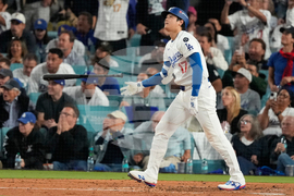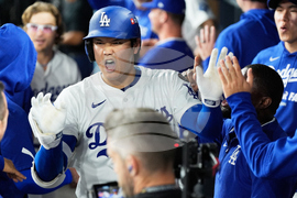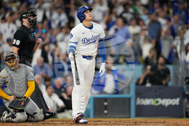 Los Angeles Dodgers' Shohei Ohtani watches after a home run against the Milwaukee Brewers during the first inning in Game 4 of baseball's National League Championship Series, Friday, Oct. 17, 2025, in Los Angeles. (AP Photo/Brynn Anderson)