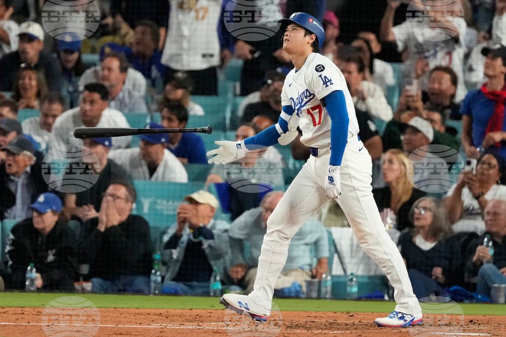 Los Angeles Dodgers' Shohei Ohtani watches his home run against the Milwaukee Brewers during the first inning in Game 4 of baseball's National League Championship Series, Friday, Oct. 17, 2025, in Los Angeles. (AP Photo/Mark J. Terrill)