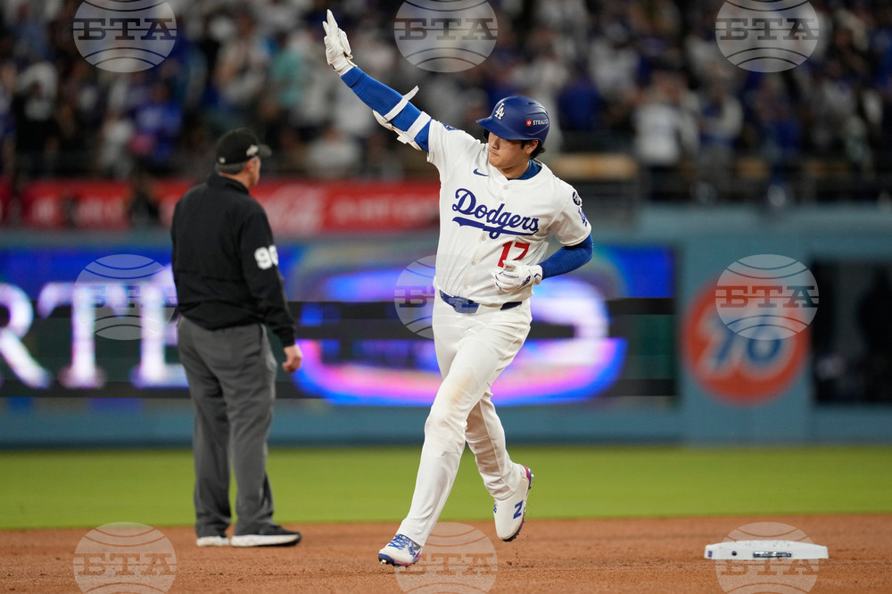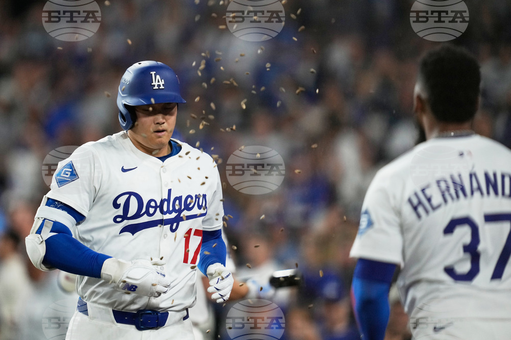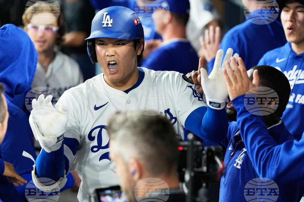 Los Angeles Dodgers pitcher Shohei Ohtani celebrates the end of the top of the fourth inning against the Milwaukee Brewers in Game 4 of baseball's National League Championship Series, Friday, Oct. 17, 2025, in Los Angeles. (AP Photo/Ashley Landis)