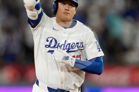 Los Angeles Dodgers pitcher Shohei Ohtani smiles during the first inning in Game 4 of baseball's National League Championship Series against the Milwaukee Brewers, Friday, Oct. 17, 2025, in Los Angeles. (AP Photo/Brynn Anderson)