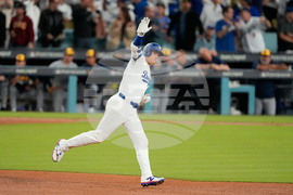 Los Angeles Dodgers' Shohei Ohtani celebrates his home run against the Milwaukee Brewers during the fourth inning in Game 4 of baseball's National League Championship Series, Friday, Oct. 17, 2025, in Los Angeles. (AP Photo/Mark J. Terrill)
