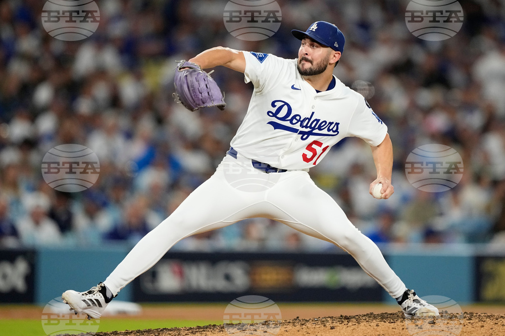 Los Angeles Dodgers pitcher Alex Vesia throws against the Milwaukee Brewers during the seventh inning in Game 4 of baseball's National League Championship Series, Friday, Oct. 17, 2025, in Los Angeles. (AP Photo/Brynn Anderson)