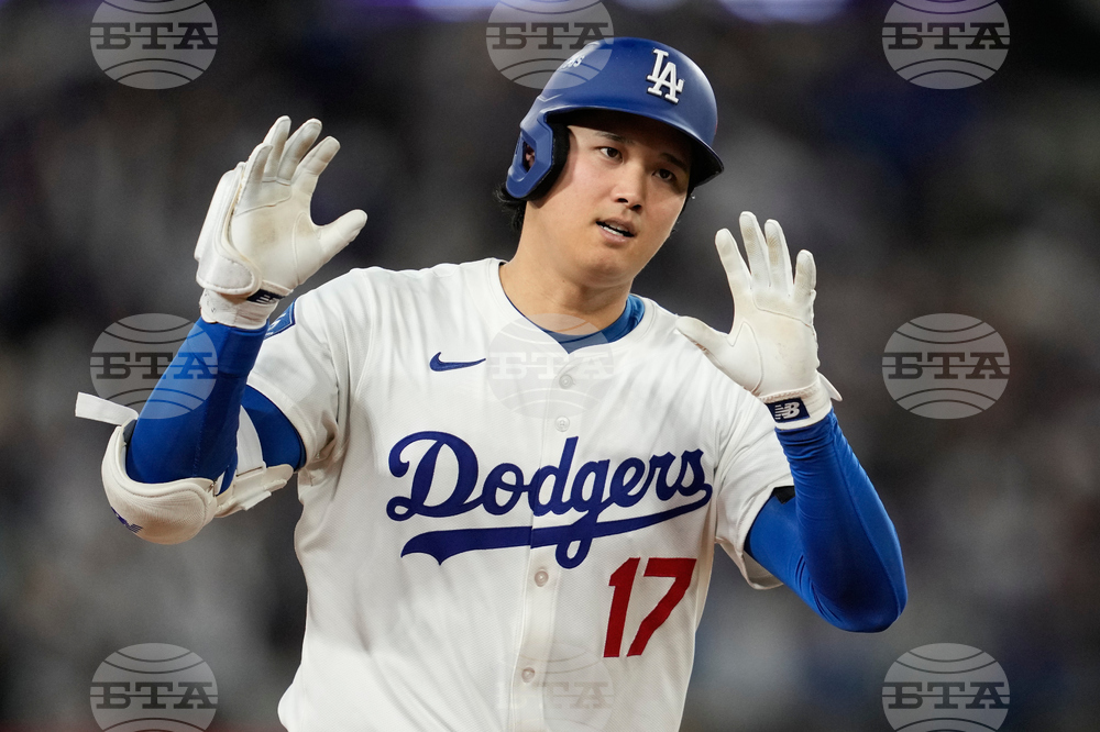 Los Angeles Dodgers pitcher Shohei Ohtani celebrates the end of the top of the third inning against the Milwaukee Brewers in Game 4 of baseball's National League Championship Series, Friday, Oct. 17, 2025, in Los Angeles. (AP Photo/Mark J. Terrill)