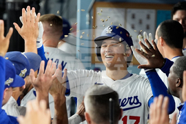 Los Angeles Dodgers pitcher Shohei Ohtani celebrates in the dugout after leaving the game against the Milwaukee Brewers during the seventh inning in Game 4 of baseball's National League Championship Series, Friday, Oct. 17, 2025, in Los Angeles. (AP Photo/Ashley Landis)