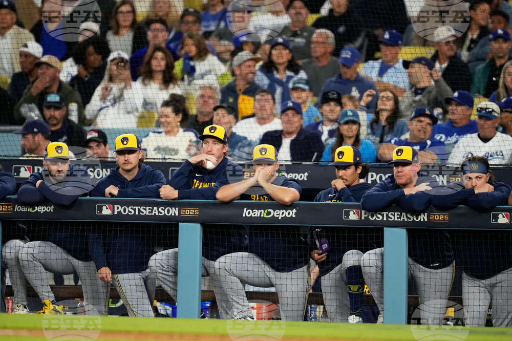 Members of the Milwaukee Brewers watch during the eighth inning in Game 4 of baseball's National League Championship Series against the Los Angeles Dodgers, Friday, Oct. 17, 2025, in Los Angeles. (AP Photo/Ashley Landis)