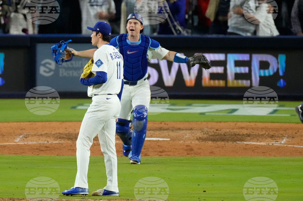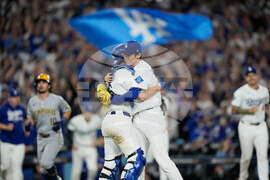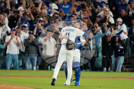 Los Angeles Dodgers pitcher Roki Sasaki and catcher Will Smith celebrates their win against the Milwaukee Brewers in Game 4 of baseball's National League Championship Series, Friday, Oct. 17, 2025, in Los Angeles. (AP Photo/Brynn Anderson)
