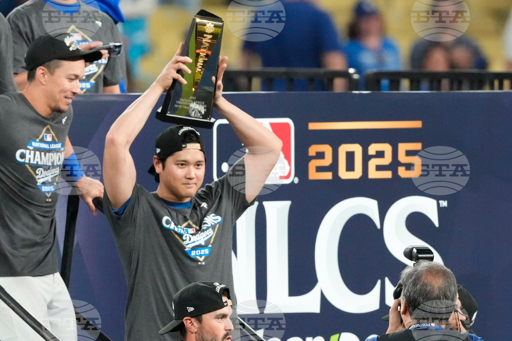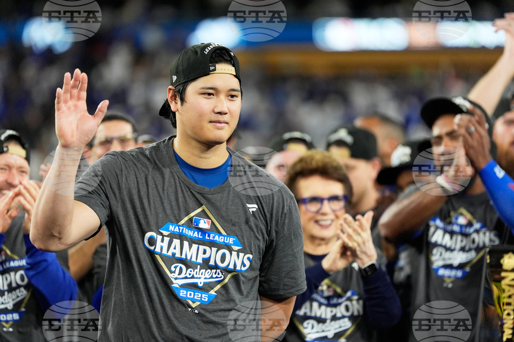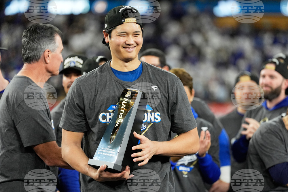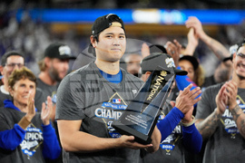 Los Angeles Dodgers' Shohei Ohtani celebrates the the trophy after their win against the Milwaukee Brewers in baseball's National League Championship Series, Friday, Oct. 17, 2025, in Los Angeles. (AP Photo/Brynn Anderson)