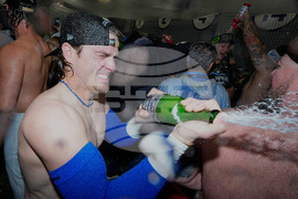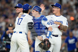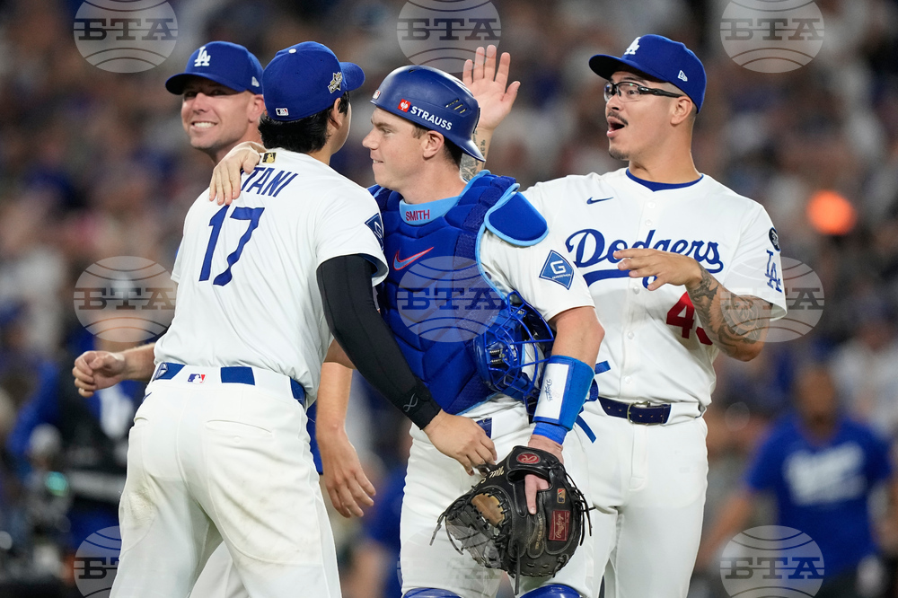 Los Angeles Dodgers celebrate their win against the Milwaukee Brewers in Game 4 of baseball's National League Championship Series, Friday, Oct. 17, 2025, in Los Angeles. (AP Photo/Brynn Anderson)