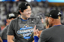 Los Angeles Dodgers pitcher Yoshinobu Yamamoto celebrates their win against the Milwaukee Brewers in baseball's National League Championship Series, Friday, Oct. 17, 2025, in Los Angeles.(AP Photo/Ashley Landis)