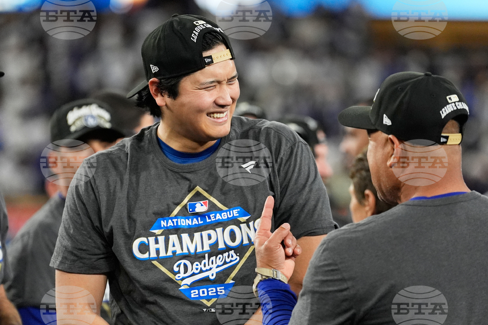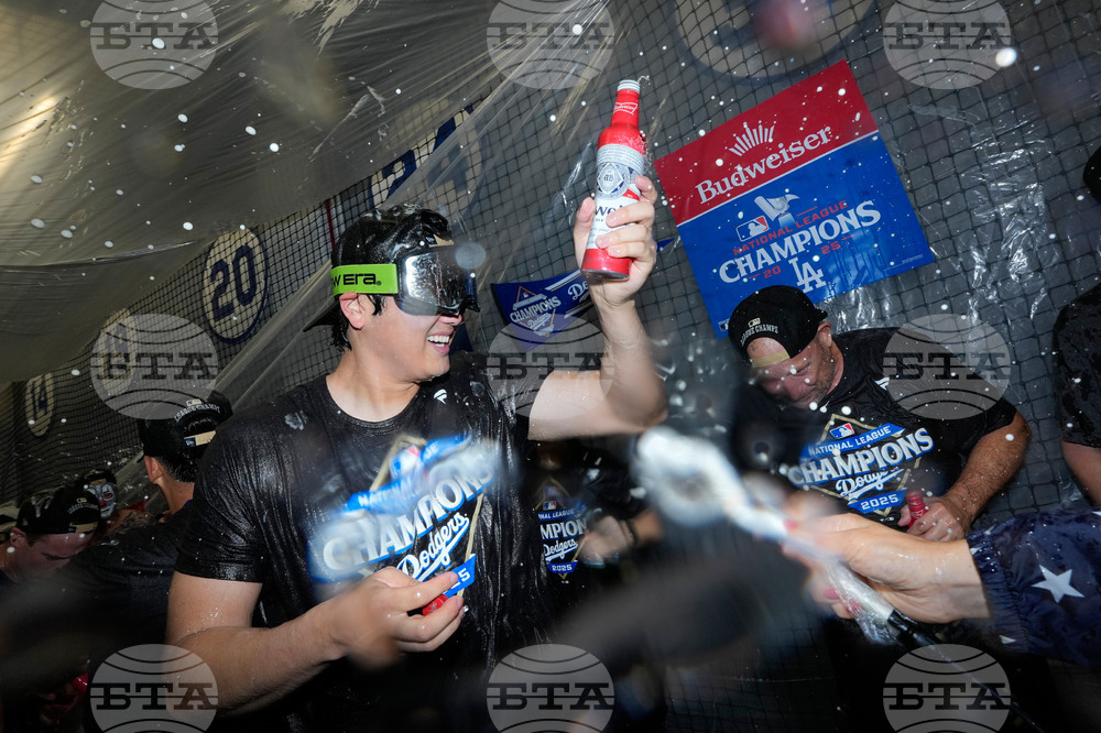 Los Angeles Dodgers pose after their win against the Milwaukee Brewers in baseball's National League Championship Series, Friday, Oct. 17, 2025, in Los Angeles. (AP Photo/Brynn Anderson)