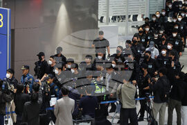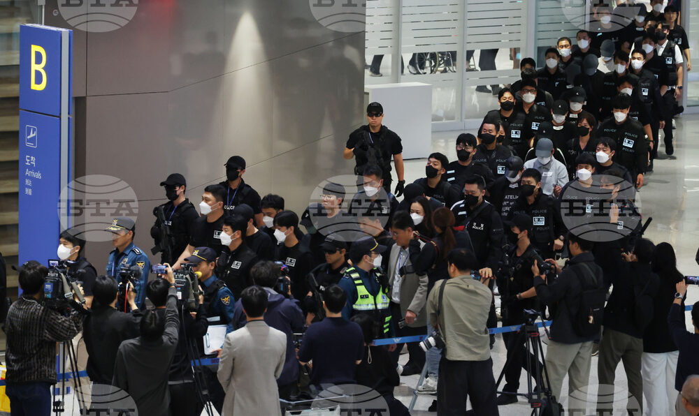 South Koreans, wearing caps, allegedly involved in online scams in Cambodia arrive at the Incheon International Airport, in Incheon, Saturday, Oct. 18, 2025. (Yonhap via AP)
