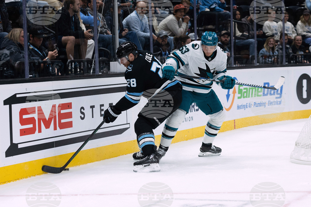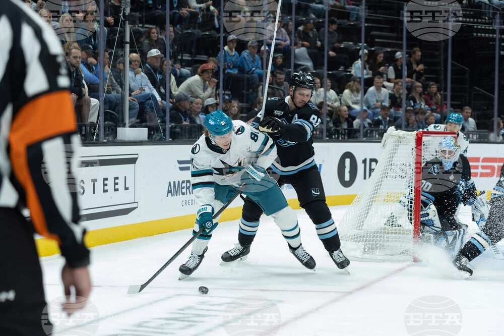San Jose Sharks center Ty Dellandrea (10) fights for the puck against Utah Mammoth center Clayton Keller (9) during the third period of an NHL hockey game Friday, Oct. 17, 2025, in Salt Lake City. (AP Photo/Melissa Majchrzak)