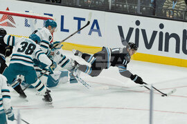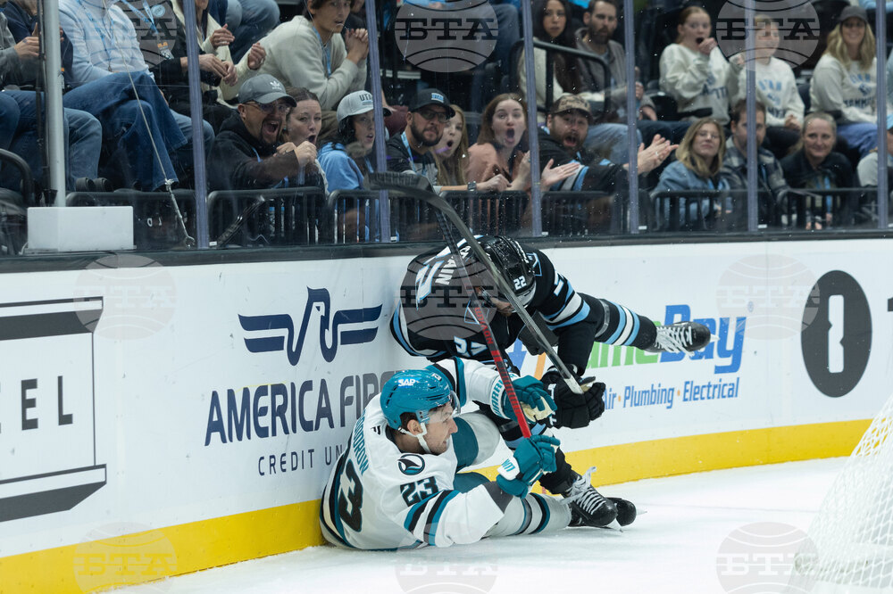 San Jose Sharks center Barclay Goodrow (23) goes down on the ice going after the puck against Utah Mammoth center Jack McBain (22) during the first period of an NHL hockey game Friday, Oct. 17, 2025, in Salt Lake City. (AP Photo/Melissa Majchrzak)
