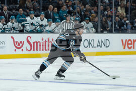 San Jose Sharks defenseman Nick Leddy breaks his stick during the third period of an NHL hockey game against the Utah Mammoth, Friday, Oct. 17, 2025, in Salt Lake City. (AP Photo/Melissa Majchrzak)