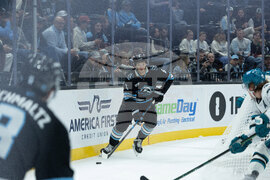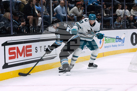 San Jose Sharks defenseman Vincent Iorio (22) skates with the puck against Utah Mammoth left wing Brandon Tanev (13) during the third period of an NHL hockey game Friday, Oct. 17, 2025, in Salt Lake City. (AP Photo/Melissa Majchrzak)
