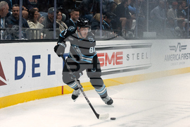 San Jose Sharks right wing Adam Gaudette (81) moves the puck against Utah Mammoth defense Mikhail Sergachev (98) during the first period of an NHL hockey game, Friday, Oct. 17, 2025, in Salt Lake City. (AP Photo/Melissa Majchrzak)