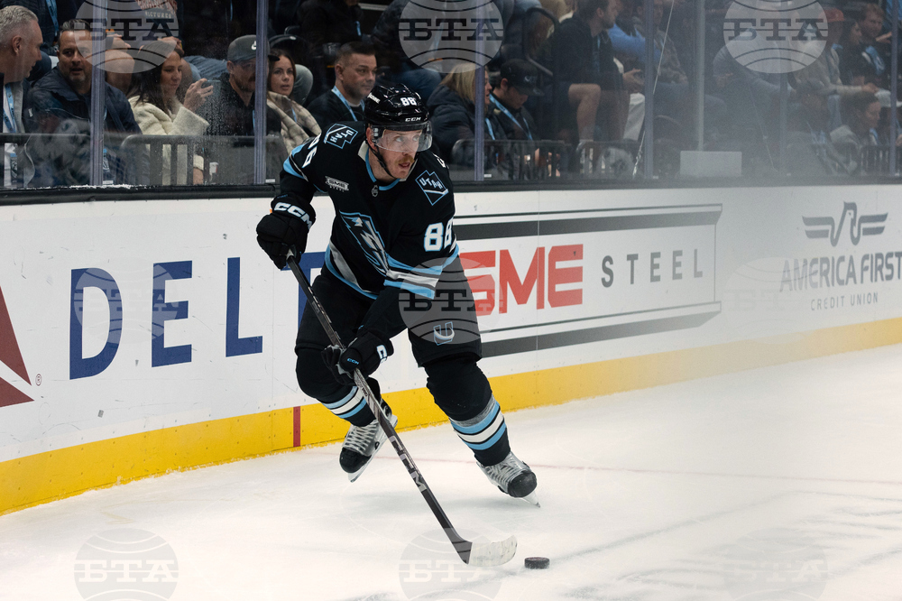 Utah Mammoth defenseman Nate Schmidt moves the puck on the ice against the San Jose Sharks during the first period of an NHL hockey game Friday, Oct. 17, 2025, in Salt Lake City. (AP Photo/Melissa Majchrzak)