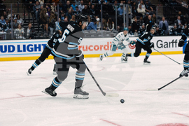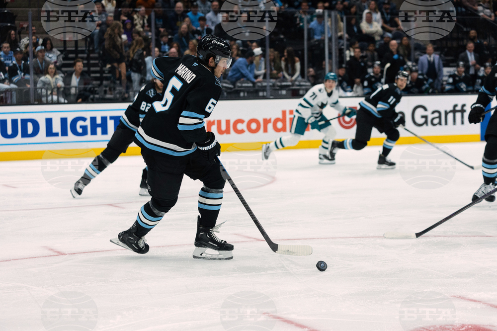 Utah Mammoth defenseman Nate Schmidt moves the puck on the ice against San Jose Sharks during the first period of an NHL hockey game Friday, Oct. 17, 2025, in Salt Lake City. (AP Photo/Melissa Majchrzak)