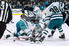 San Jose Sharks center Ty Dellandrea (10) faces off against Utah Mammoth center Logan Cooley (92) during the second period of an NHL hockey game Friday, Oct. 17, 2025, in Salt Lake City. (AP Photo/Melissa Majchrzak)