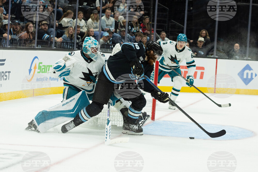 San Jose Sharks goalie Yaroslav Askarov (30) defends the goal against the Utah Mammoth during the second period of an NHL hockey game Friday, Oct. 17, 2025, in Salt Lake City. (AP Photo/Melissa Majchrzak)