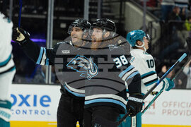 Utah Mammoth center Liam O'Brien (38) celebrates after a goal with left wing Brandon Tanev, left, during the second period of an NHL hockey game against the San Jose Sharks, Friday, Oct. 17, 2025, in Salt Lake City. (AP Photo/Melissa Majchrzak)