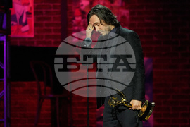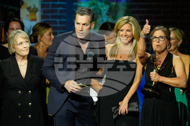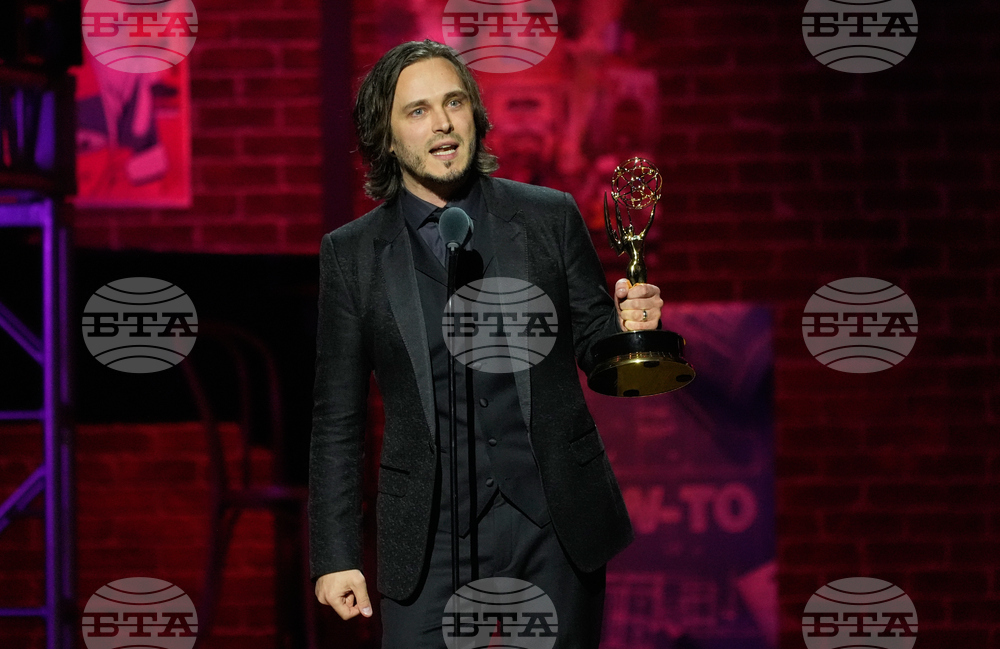 "Hot Bench" judges Michael Corriero, left, and Tanya Acker, center, look on as the show's executive producer David Theodosopoulos accepts the award for Outstanding Legal/Courtroom Program during the 52nd Annual Daytime Emmy Awards on Friday, Oct. 17, 2025, at Pasadena Civic Auditorium in Pasadena, Calif. (AP Photo/Chris Pizzello)