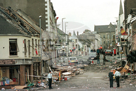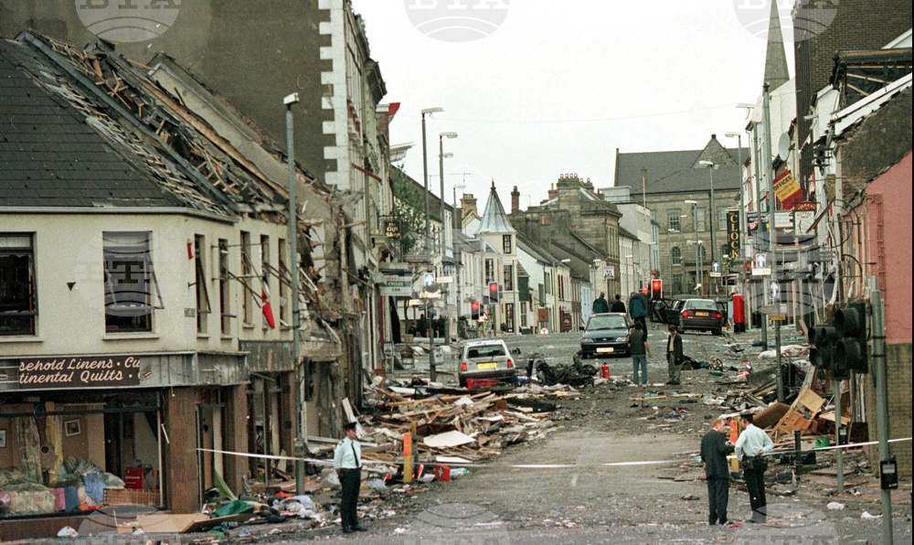 FILE - Royal Ulster Constabulary Police officers stand on Market Street, the scene of a car bombing in the centre of Omagh, Co Tyrone, 72 miles west of Belfast, Northern Ireland, on Aug. 15, 1998. (AP Photo/Paul McErlane, File)
