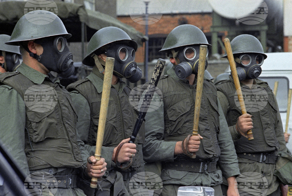 FILE - British Army Riot Squad troops wearing gas masks, bullet proof vests and wielding two foot long batons are seen at a demonstration in Belfast, Northern Ireland on Oct. 2, 1969. (AP Photo/Peter Kemp, File)