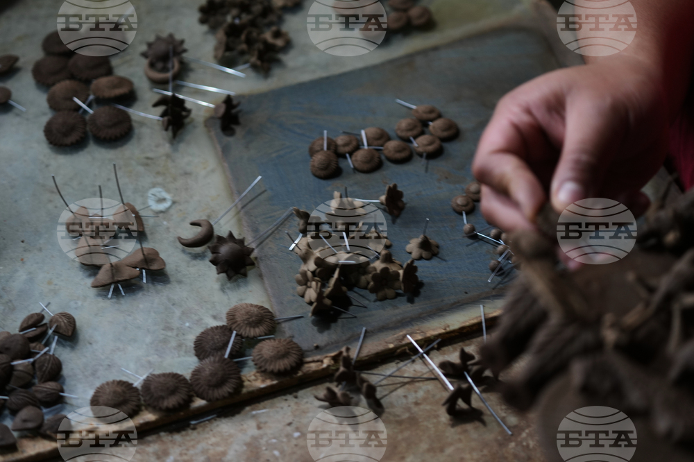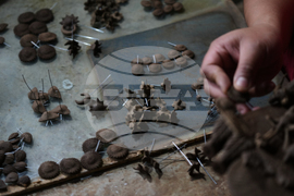 Mexican craftsman Luis Hernandez inserts small fragile clay figures into a tree of life sculpture at his atelier in Metepec, Mexico, Thursday, Oct. 9, 2025. (AP Photo/Fernando Llano)