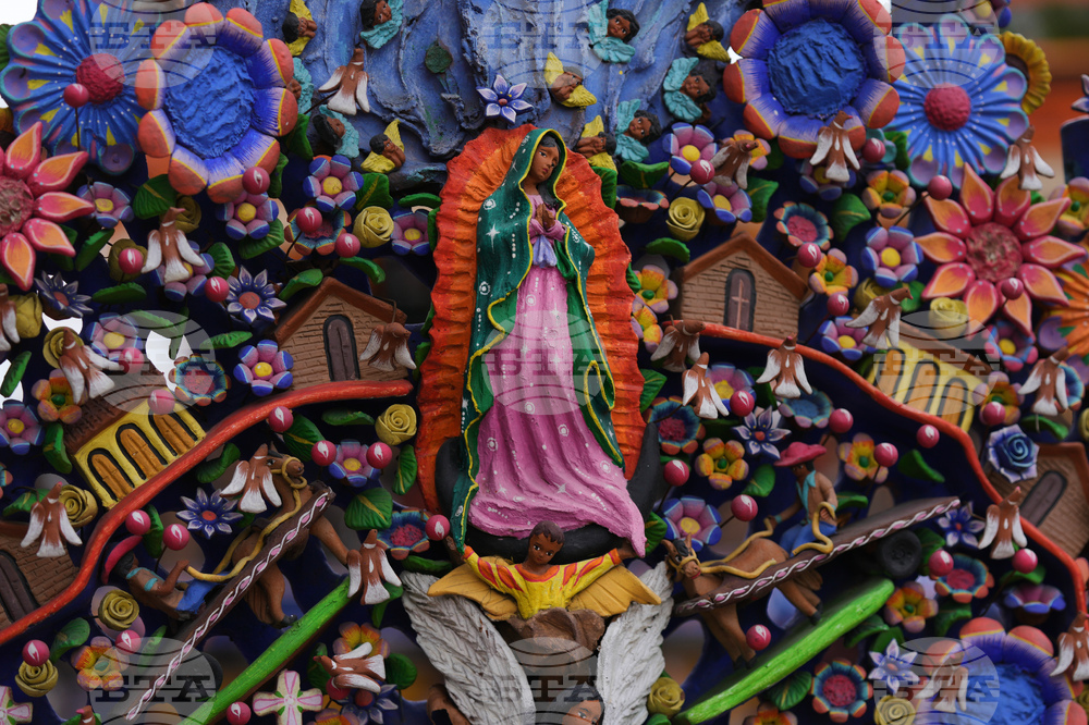 A statue of the Virgin of Guadalupe decorates a tree of life sculpture in the main square of Metepec, Mexico, Thursday, Oct. 9, 2025. (AP Photo/Fernando Llano)
