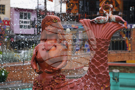 A fountain with a figure of Tlanchana, a half-woman half-serpent figure who legend has it once ruled the waters around the town, decorates the main square of Metepec, Mexico, Thursday, Oct. 9, 2025. (AP Photo/Fernando Llano)