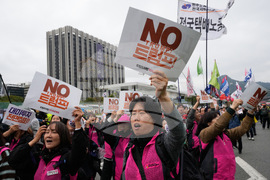 South Korean protesters attend a rally against U.S. President Donald Trump's tariffs policy on South Korea, in Seoul, South Korea, Saturday, Oct. 18, 2025. (AP Photo/Ahn Young-joon)