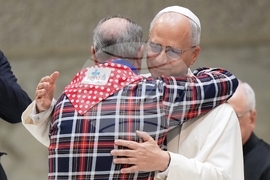 Pope Leo XIV, right, meets the participants in the Jubilee of the Roma, Sinti, and Travellers in the Paul VI Hall, at the Vatican, Saturday, Oct. 18, 2025. (AP Photo/Andrew Medichini)