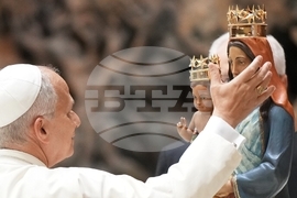 Pope Leo XIV places a crown on a statue of Mary and Jesus as he meets the participants in the Jubilee of the Roma, Sinti, and Travellers in the Paul VI Hall, at the Vatican, Saturday, Oct. 18, 2025. (AP Photo/Andrew Medichini)