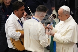 Pope Leo XIV autographs a violin as he meets the participants in the Jubilee of the Roma, Sinti, and Travellers in the Paul VI Hall, at the Vatican, Saturday, Oct. 18, 2025. (AP Photo/Andrew Medichini)