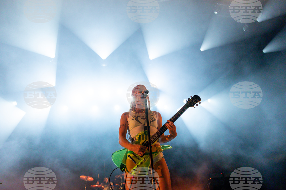 Rhian Teasdale of Wet Leg performs on Friday, Oct. 17, 2025, at The Greek Theatre in Los Angeles. (Photo by Andrew Park/Invision/AP)