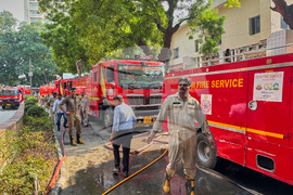 Fire officials douse a fire at a residential complex that houses Indian lawmakers, in New Delhi, India, Saturday, Oct.18, 2025. (AP Photo)