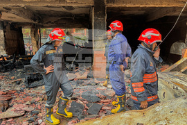 Fire officials assess the situation after dousing a fire at a residential complex that houses Indian lawmakers, in New Delhi, India, Saturday, Oct.18, 2025. (AP Photo/Shonal Ganguly)
